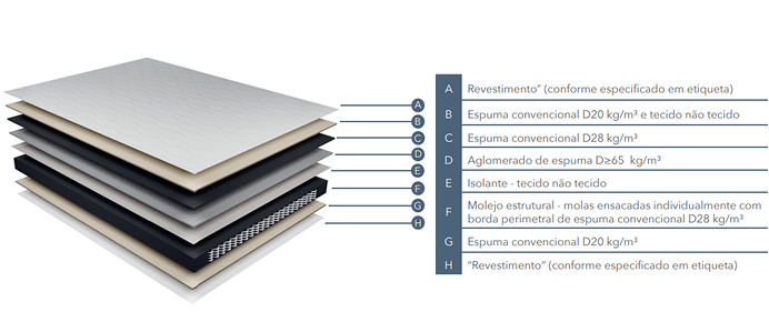 Molas ensacadas individualmente, adequado para BIOTIPOS diferentes, proporcionando um sono confortável, sendo complementada por borda perimetral em espuma de alta densidade, garantindo a estabilidade funcional da estrutura.